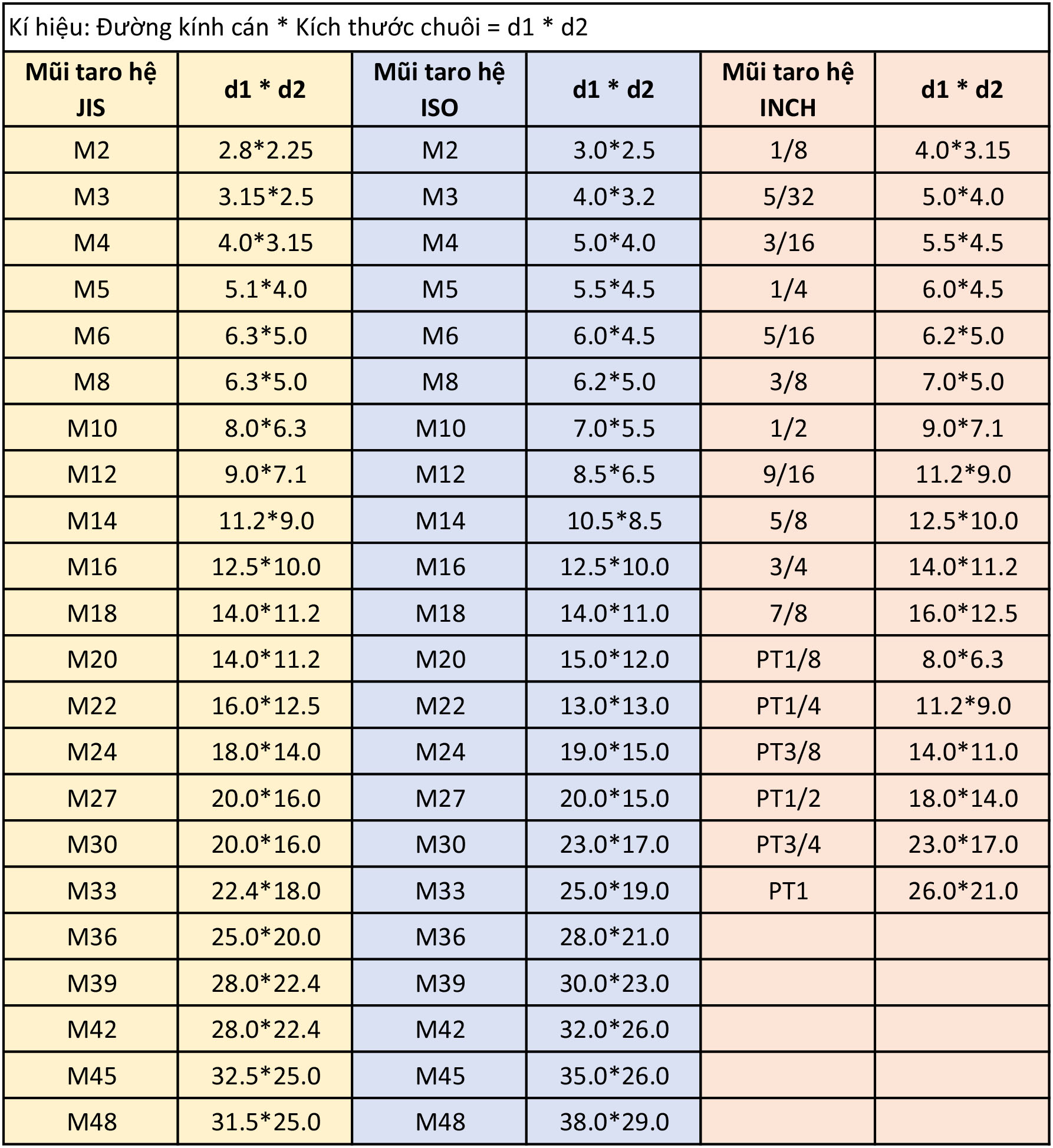 Trong trường hợp quý khách hàng không biết mũi taro của mình thuộc hệ nào, sẽ khó để lựa chọn được loại chuck kẹp phù hợp. Quý vị hãy đo 2 kích thước d1 và d2, sau đó đối chiếu với bảng bên dưới. Giả dụ, mũi taro có d1 là 3.15mm, d2 là 2.5mm, vậy thì sẽ tương ứng với mũi taro M3 của hệ JIS, vậy kết luận cuối cùng là dùng chuck kẹp M3-JIS.