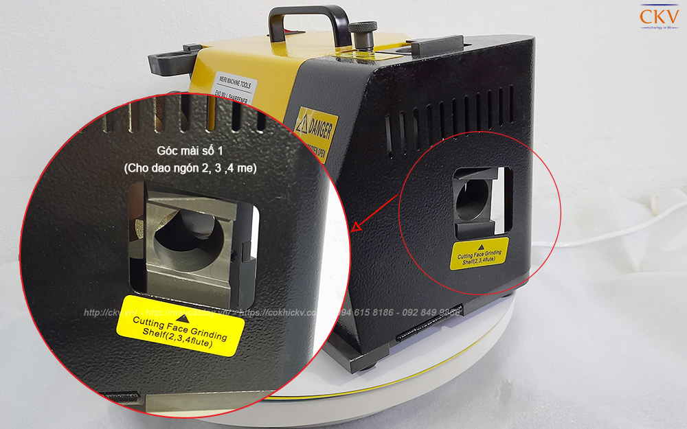 Bước 2: Tại góc mài số 1 của Máy mài dao phay ngón Endmill CKV-H1, (nằm ở bên cạnh sườn phải của máy), ta đưa dao phay vào, góc mài này có thể dùng chung cho cả 3 loại lưỡi cắt.