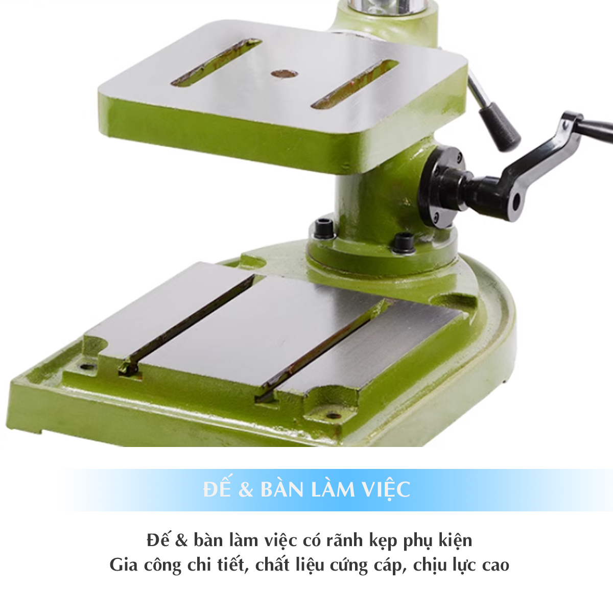 5/ Bàn làm việc vuông 265x265mm có rãnh kẹp phụ kiện, phôi tiện lợi & cho phép nâng hạ, xoay. Đế được gia công cứng cáp, vững trãi.