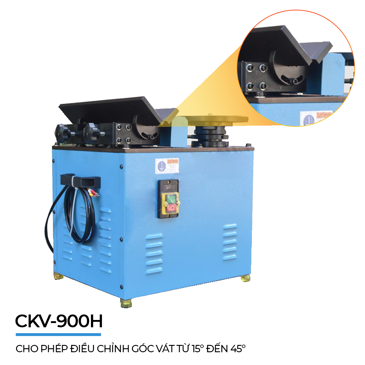 1/ CKV-900H cho phép điều chỉnh góc vát từ 15 đến 45 độ, vát góc C từ C0.1 đến C3.0mm bằng lưỡi dao tiêu chuẩn theo máy. Máy cho phép nâng cấp để vát góc R từ R2-R3